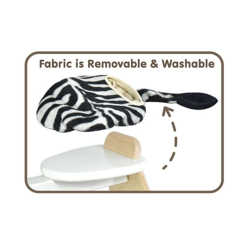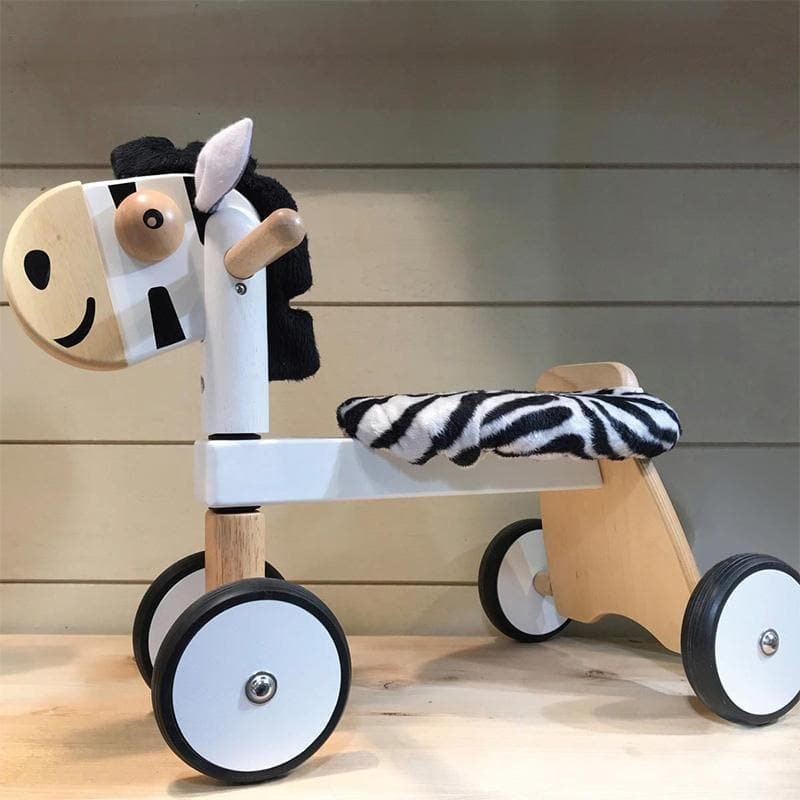A colourful ride-on zebra in a steerable trike configuration. This sturdy wooden toy features a cushioned seat, a colourfully padded cloth mane and padded tail.